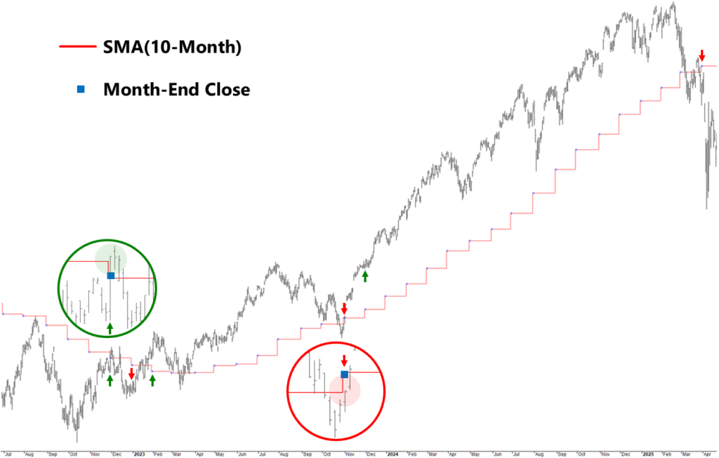 This strategy is defined by a single state variable: whether SPY’s month-end close is above or below its 10-month simple moving average (SMA). Signals are evaluated and trades execute on the month-end close (trade-on-close; assumes a market-on-close order). Let “t” denote the month-end signal bar.